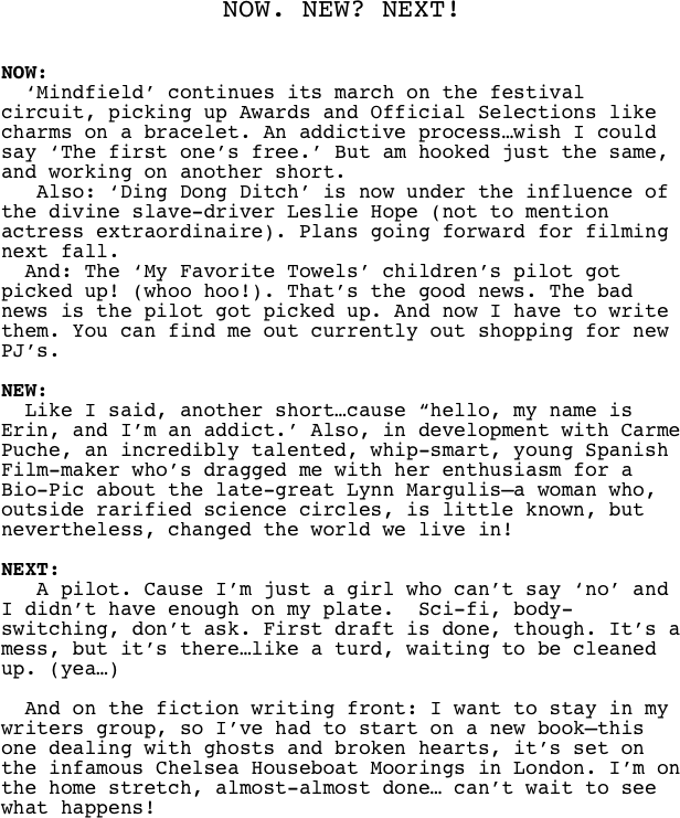 NOW. NEW? NEXT! NOW: ‘Mindfield’ continues its march on the festival circuit, picking up Awards and Official Selections like charms on a bracelet. An addictive process…wish I could say ‘The first one’s free.’ But am hooked just the same, and working on another short. Also: ‘Ding Dong Ditch’ is now under the influence of the divine slave-driver Leslie Hope (not to mention actress extraordinaire). Plans going forward for filming next fall. And: The ‘My Favorite Towels’ children’s pilot got picked up! (whoo hoo!). That’s the good news. The bad news is the pilot got picked up. And now I have to write them. You can find me out currently out shopping for new PJ’s. NEW: Like I said, another short…cause “hello, my name is Erin, and I’m an addict.’ Also, in development with Carme Puche, an incredibly talented, whip-smart, young Spanish Film-maker who’s dragged me with her enthusiasm for a Bio-Pic about the late-great Lynn Margulis—a woman who, outside rarified science circles, is little known, but nevertheless, changed the world we live in! NEXT: A pilot. Cause I’m just a girl who can’t say ‘no’ and I didn’t have enough on my plate. Sci-fi, body-switching, don’t ask. First draft is done, though. It’s a mess, but it’s there…like a turd, waiting to be cleaned up. (yea…) And on the fiction writing front: I want to stay in my writers group, so I’ve had to start on a new book—this one dealing with ghosts and broken hearts, it’s set on the infamous Chelsea Houseboat Moorings in London. I’m on the home stretch, almost-almost done… can’t wait to see what happens!